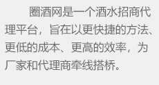 圈酒招商網主要為白酒、啤酒、葡萄酒、保健酒等酒類企業提供酒水招商、代理批發、加盟等信息
